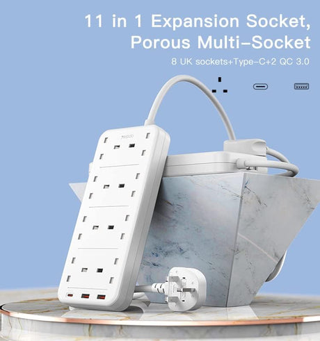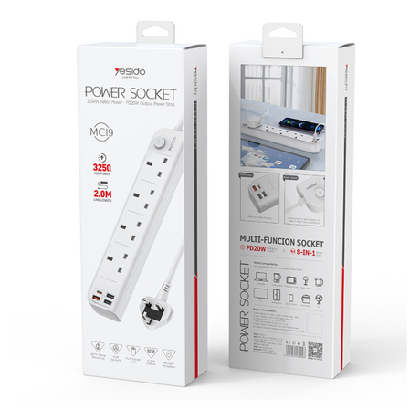 Yesido 8-1 MC-27 4 Plugs + PD 20W+2 QC3.0 Ports 3250W Multi-functional High Power Socket(UK Plug)